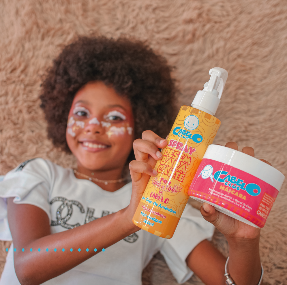 Máscara de hidratação, gel cola, gel com glitter, spray desembaraçante e pomada teia. Uma linha completa que promovem limpeza, suavidade, hidratação, maciez e perfume para crianças e adolescentes.